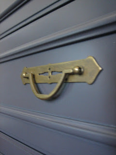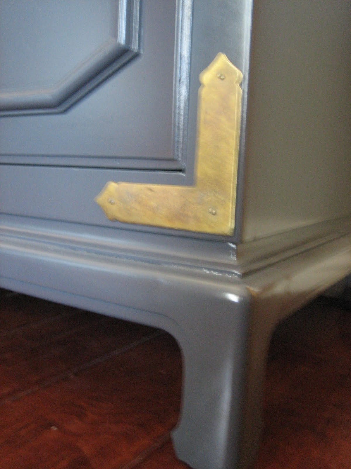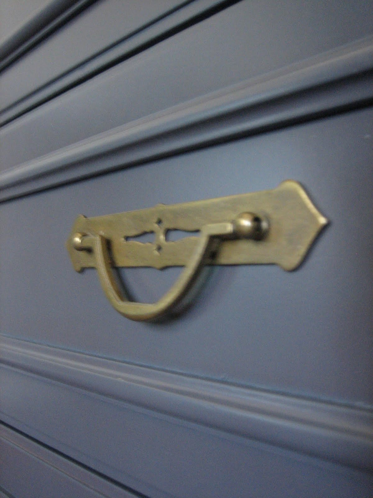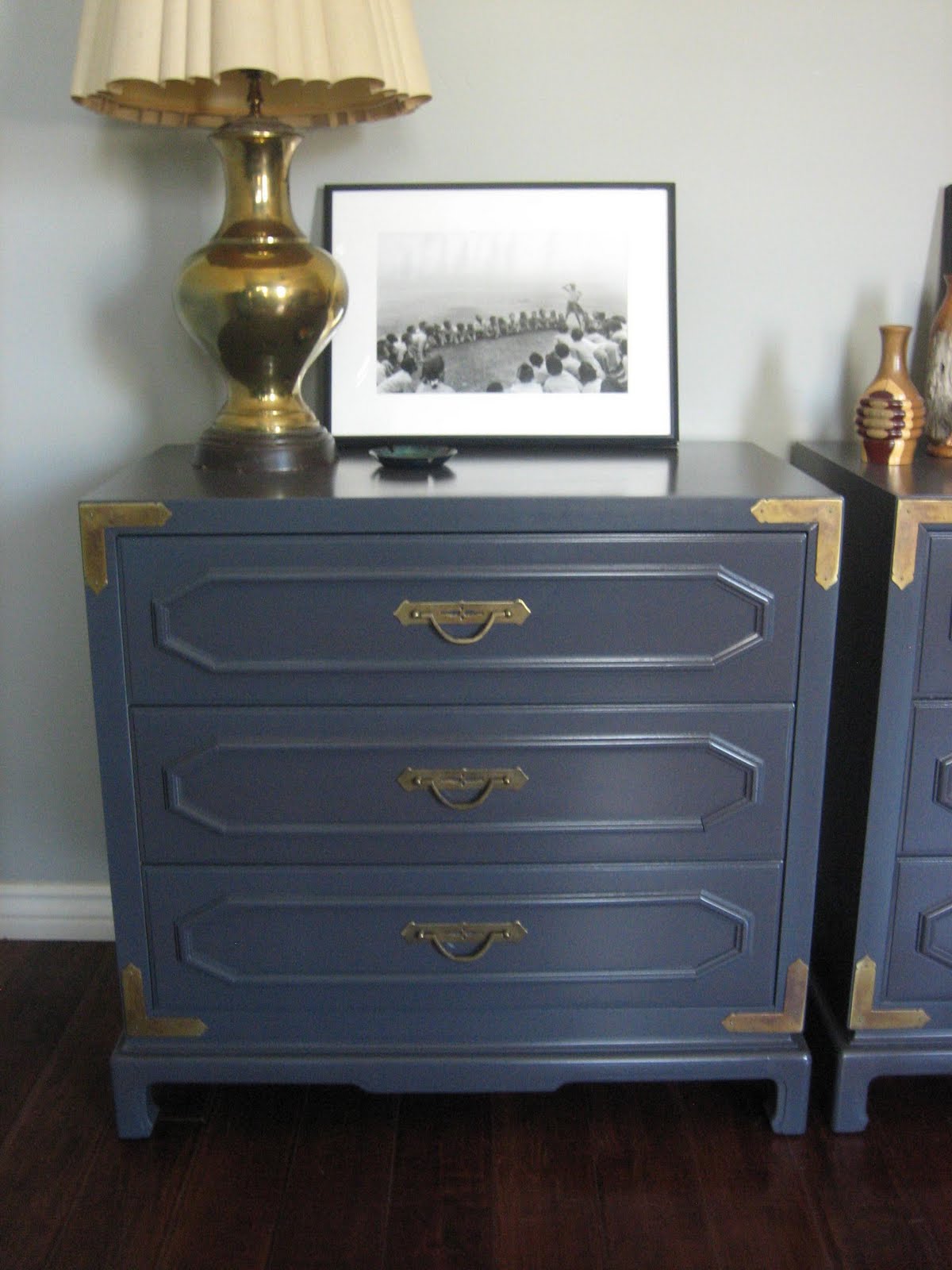 Vintage Thomasville. Glossy dark gray cloud finish. Reminds me of an ominous storm cloud as they can have the appearance of a dark gray blue in certain lighting. Brass hardware. Neat base. Three dove tailed drawers.