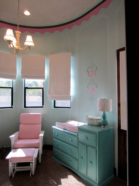 How adorable is this nursery! Makes me almost want to try for a little sister for Ozzy- ALMOST! :) Mike refinished the crib and changing table in a turquoise, glider and ottoman in white. The sexy Mama behind this room is a repeat customer. She had purchased a few pieces in the past in that same turquoise and thought this color would work well for the nursery. She thought right :)